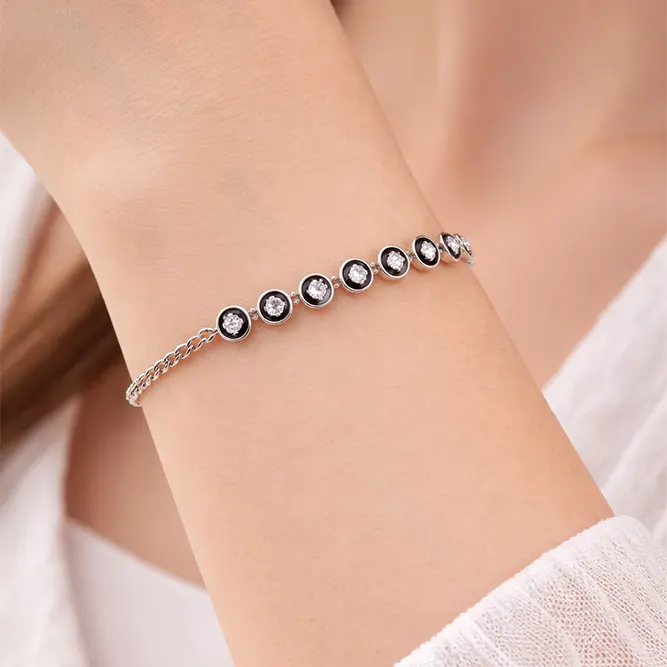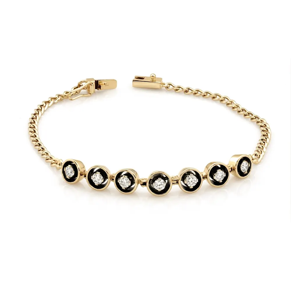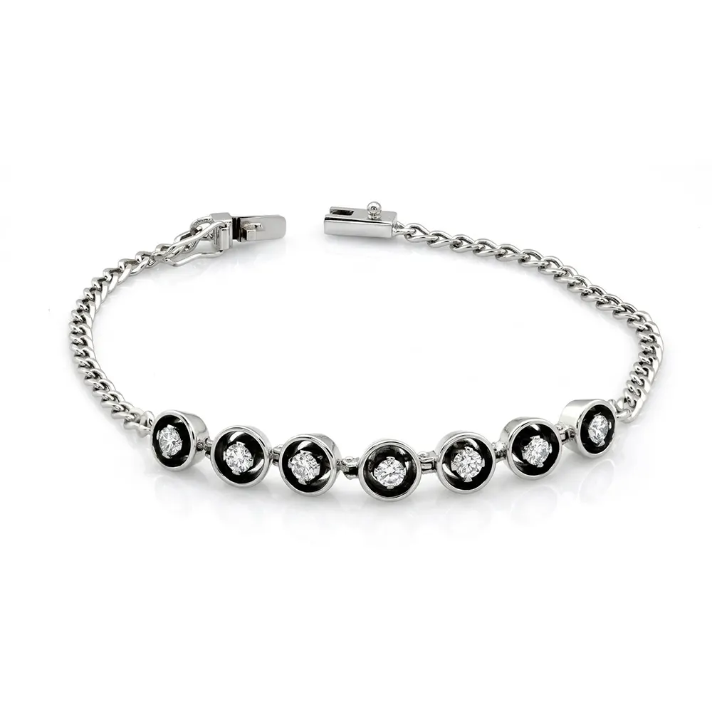 Acest model de Brățară Dama Aur cu 7 Diamante este executat manual si are un gramaj aproximativ de 8 gr., avand montate 7 diamante taietura briliant de 0,10ct in fiecare caseta conica(0,70ct)oferind o separare frumoasa intre fiecare piatra strălucitoare.