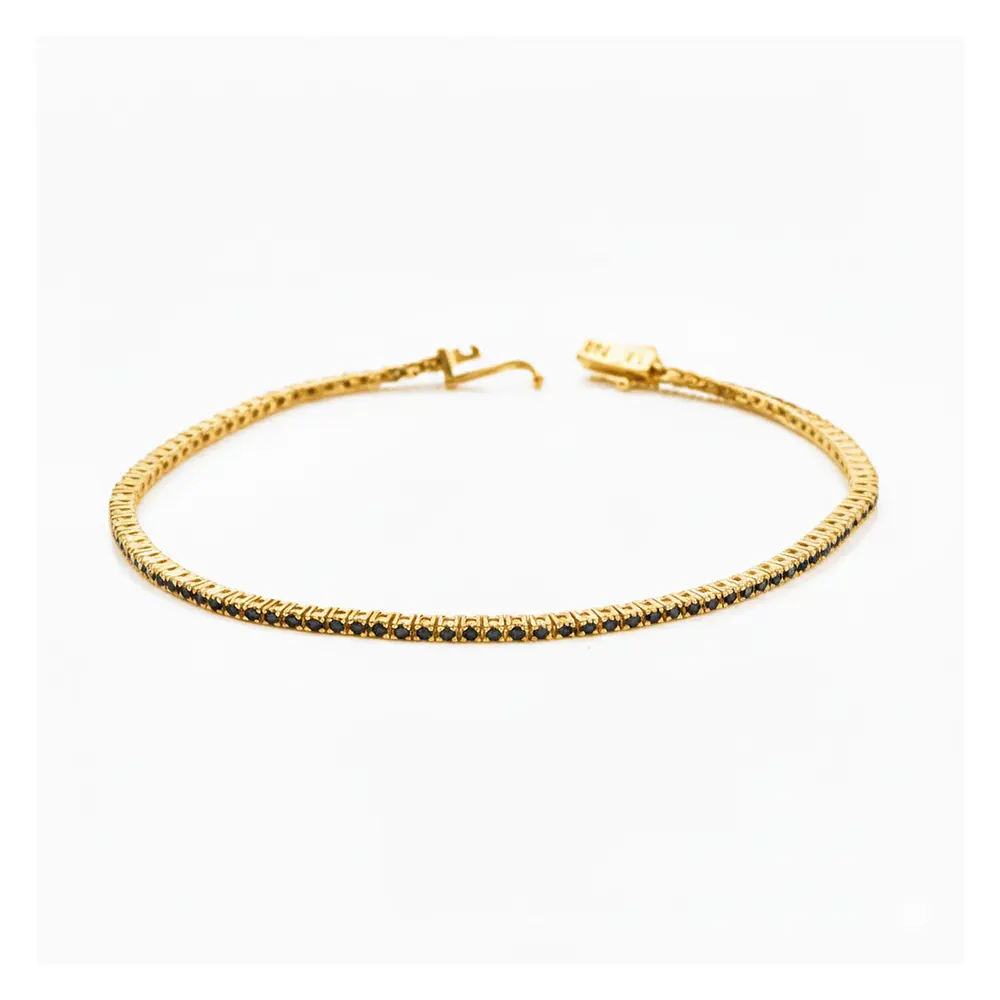 Adaugă o notă de mister și lux sofisticat încheieturii tale cu această brățară Tennis din aur alb de 18k, o piesă de bijuterie rară, definită prin contrast și eleganță. Lucrată manual cu o atenție meticuloasă la detalii, brățara este finisată prin rodiere neagră, un procedeu special care intensifică profunzimea celor 1.37ct de diamante negre.