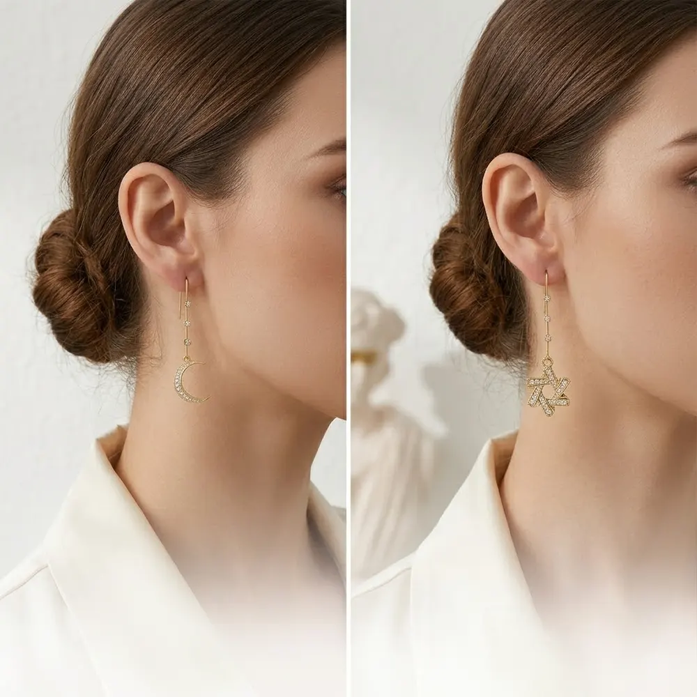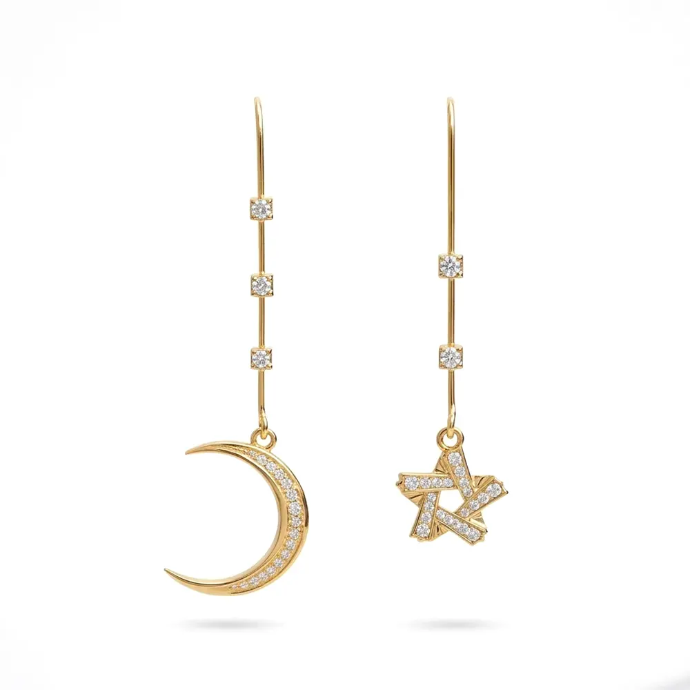 Alege un stil delicat si modern cu acesti cercei aur lungi luna si stea cu diamante, creati pentru a evidentia eleganta feminina. Designul inspirat din simboluri cosmice aduce un aer misterios si rafinat.