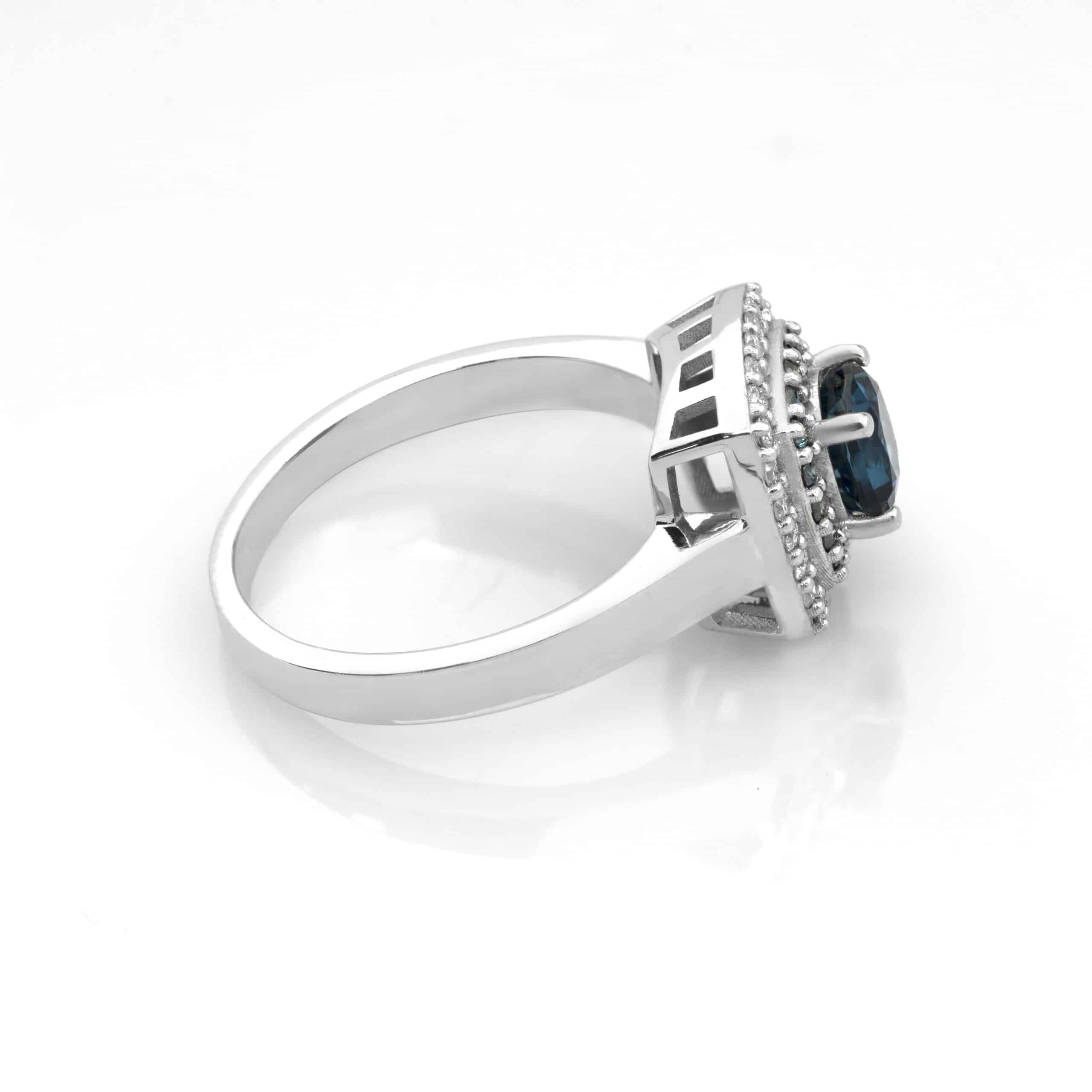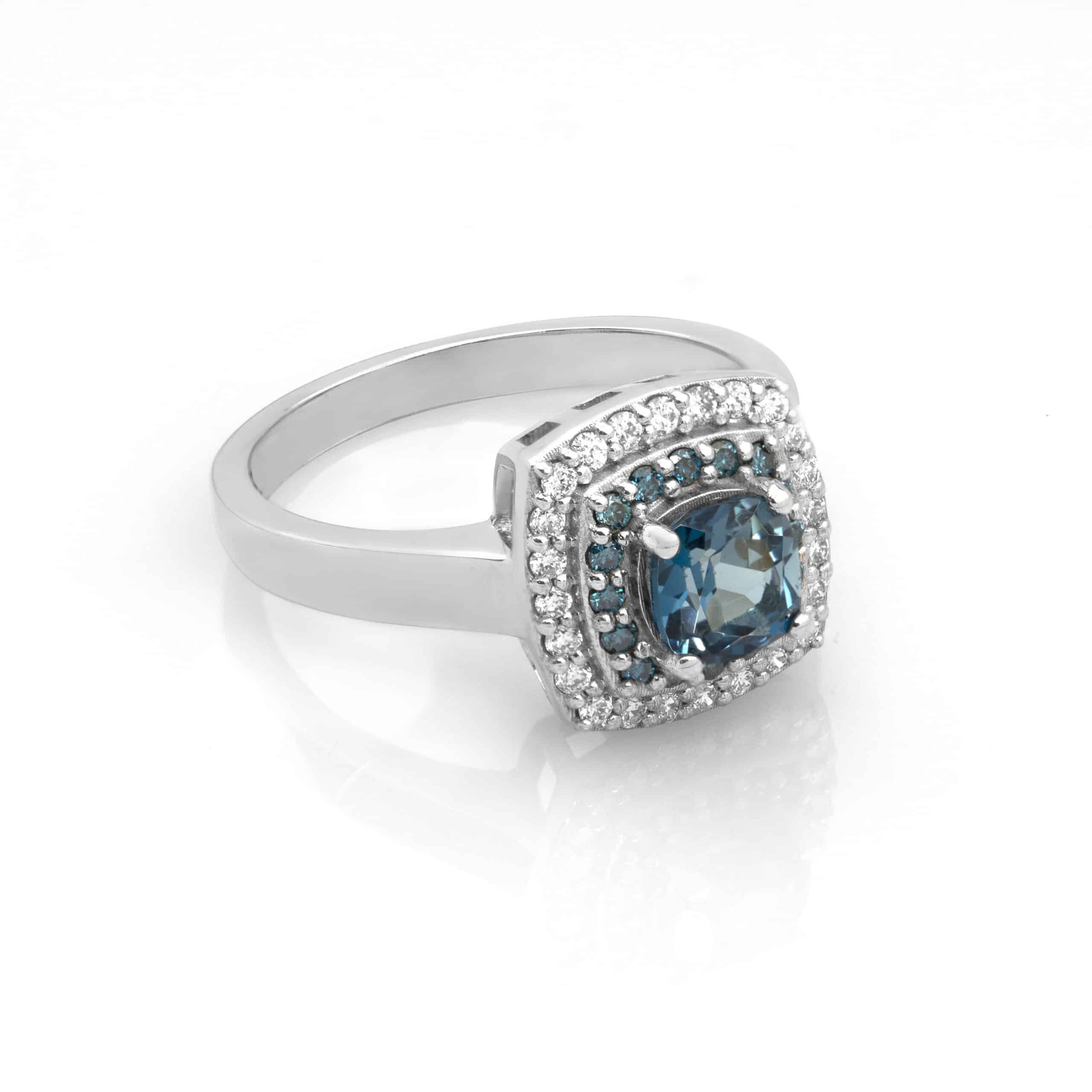Inelul cu blue topaz și diamante este realizat din aur de 14K, cu o greutate de aprox. 3,62 g. Piesa centrală este un blue topaz de 0,73 ct. Acesta este completat de pietre secundare diamante albastre (0,12 ct) și diamante incolore 0,15 ct(VS/G). Model elegant, potrivit pentru ocazii speciale sau purtare zilnică.