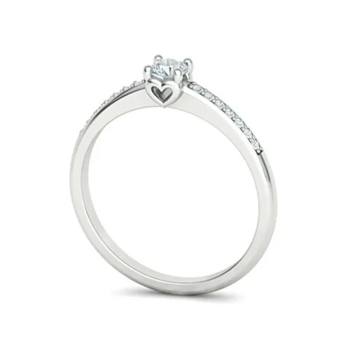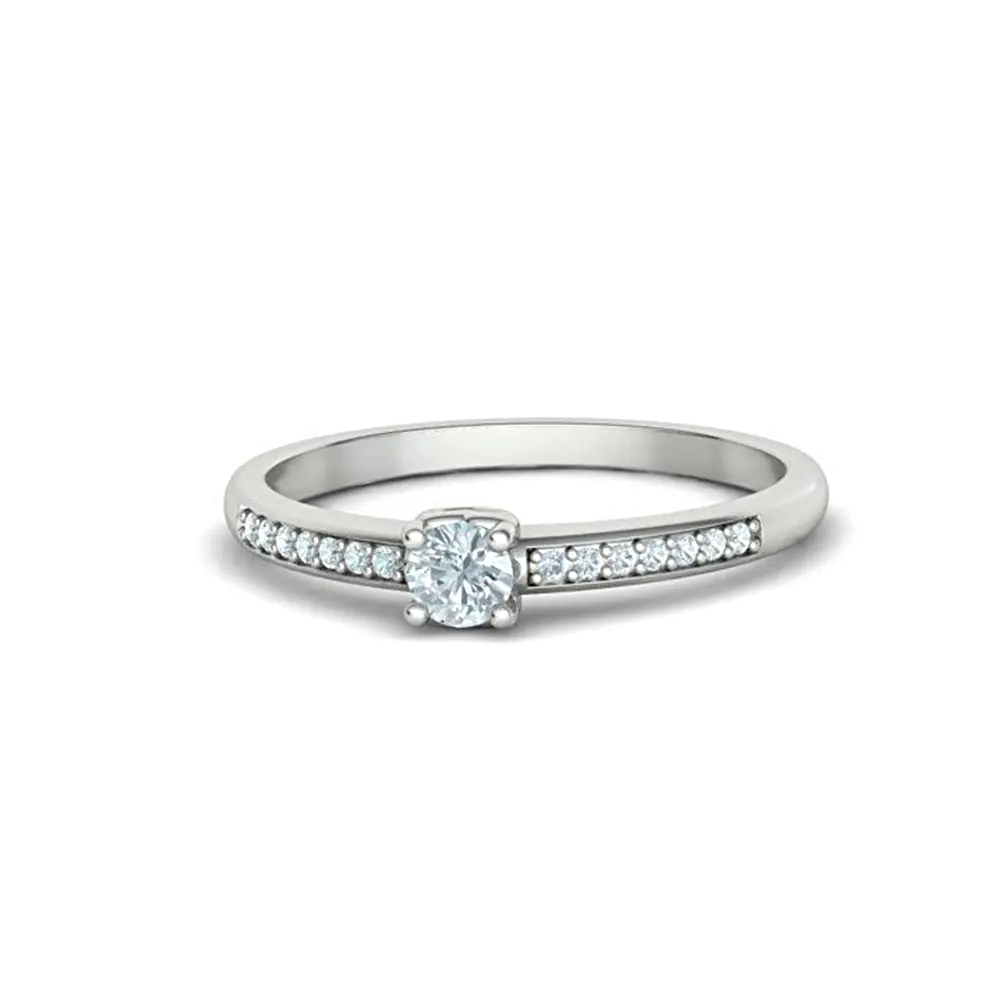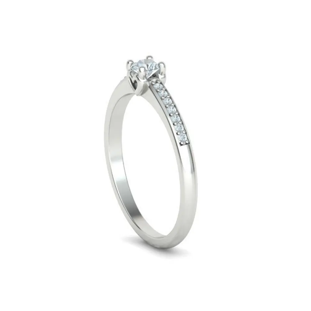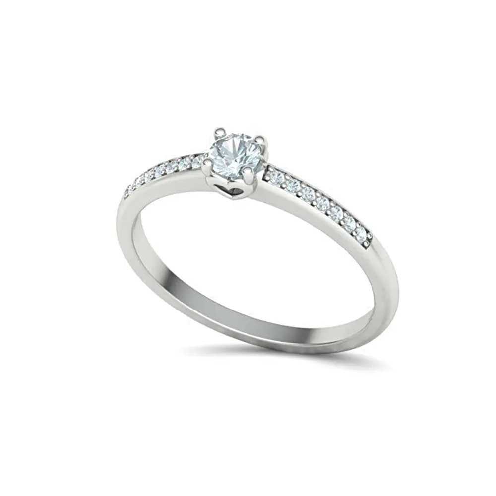 Inel de logodna aur alb cu diamante este o bijuterie eleganta si fina. Piesa are un diamant central de 0.15 ct. Diamantul are claritate VS si culoare G/H. Modelul este completat de 14 diamante de 1.1 mm, cu un total de 0.10 ct. Toate diamantele sunt naturale, cu aceeasi calitate VS si culoare G/H. Inelul este realizat din aur alb 14k si are un gramaj de aproximativ 2.1 gr.