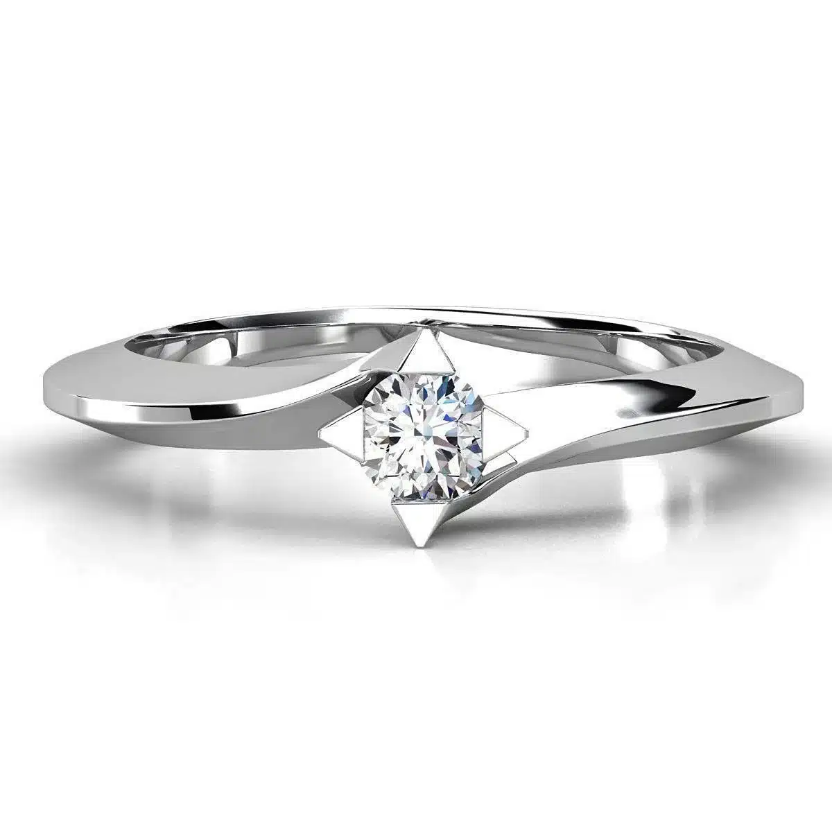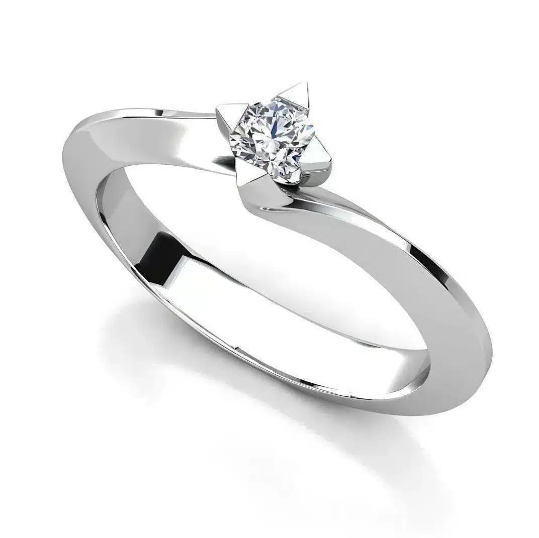 Detalii: aur alb 14K sau 18K, diamant natural 0.10ct, claritate VS, culoare G–H, prindere clasica, finisaj lucios, realizat manual.