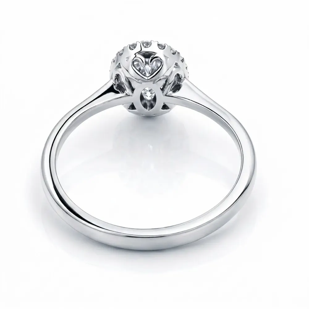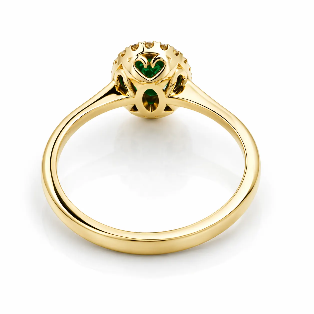 Smaraldul natural oval are dimensiunea de 5×7 mm si un carataj de aproximativ 0.75ct. Culoarea sa profunda transmite eleganta si distinctie. Este inconjurat de 20 de diamante fine, fiecare avand aproximativ 1 mm, care adauga stralucire si contrast.