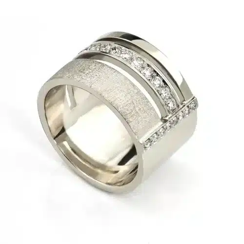Cu 15 diamante pe banda din mijloc și alte 8 pe bentita perpendiculara, acest inel este o veritabilă comoară strălucitoare. Cu un carataj total de 0.53ct, diamantele aduc o lumină specială în viața ta, amintindu-ți de frumusețea și prețiozitatea fiecărui moment.