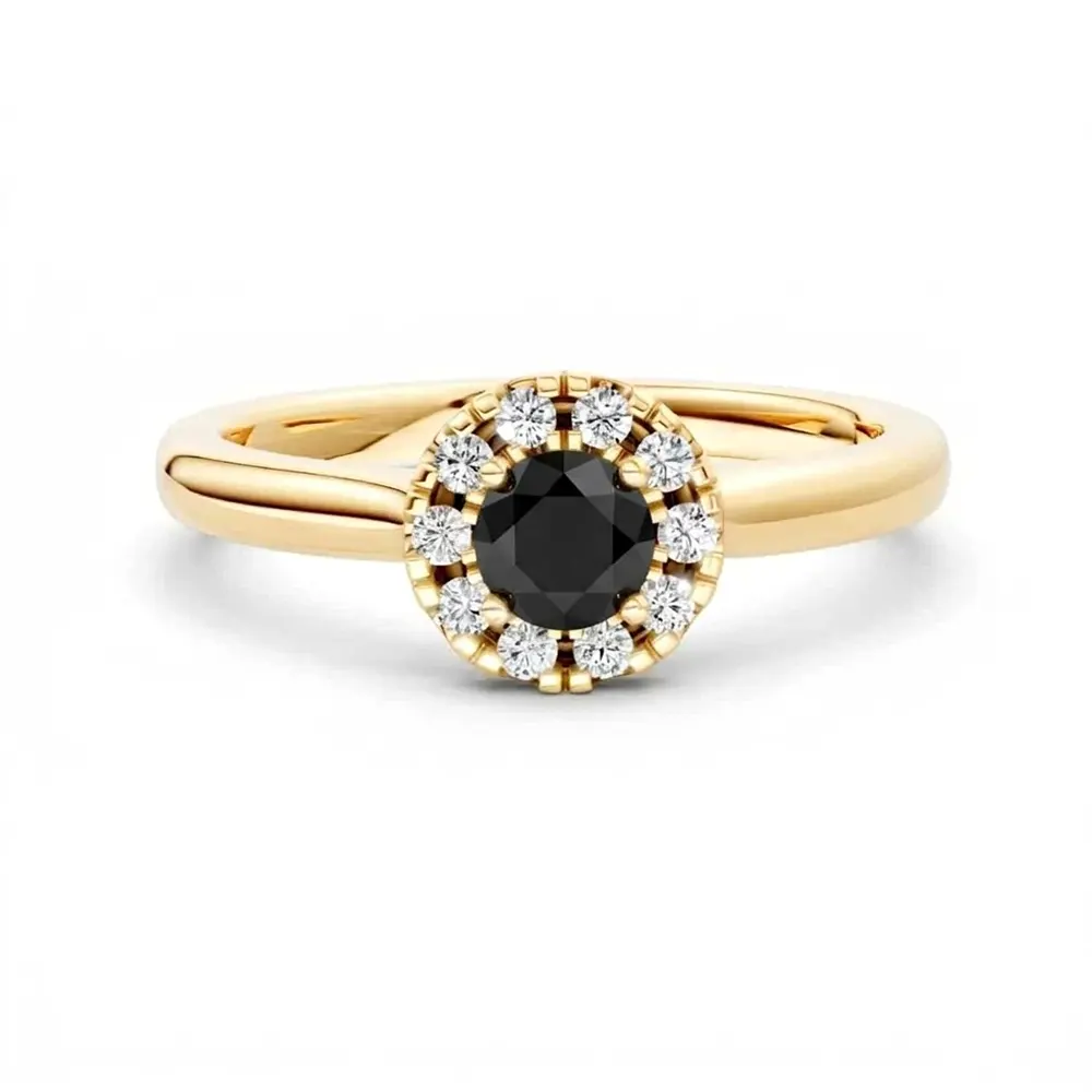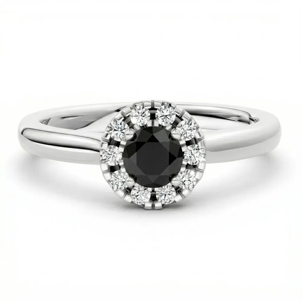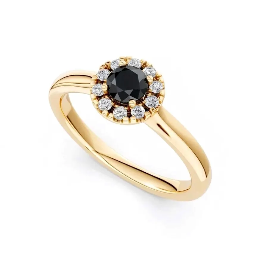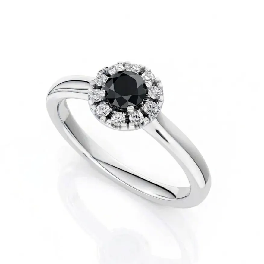 Detalii: aur 14K sau 18K, diamant negru central 0,20ct (calitate AAA), 10 diamante incolore de 1,4 mm (0,13ct, VS, G/H), montura anturaj, finisaj lucios.