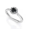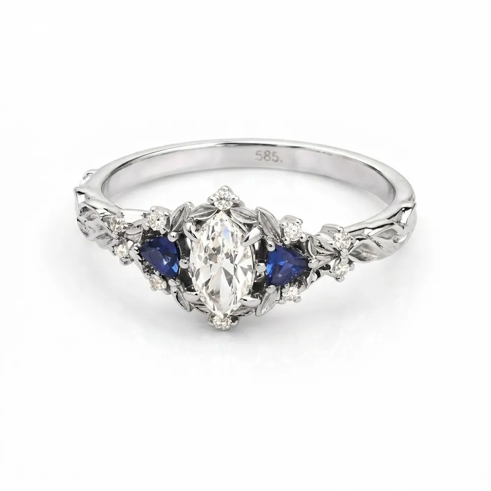 Diamantul este completat de două safire naturale cu tăietură trilliant cu latura de 3 mm. Acestea adaugă contrast și profunzime. Nuanța albastră evidențiază piatra centrală.