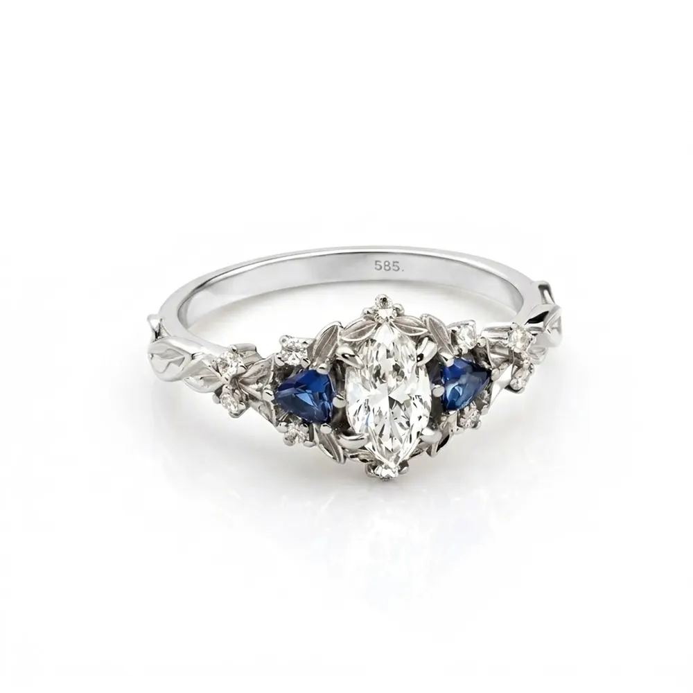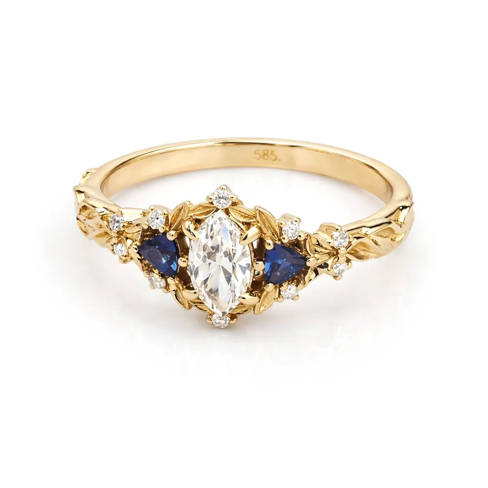 Acest inel de logodnă din aur galben 14K cu diamant marquise și safire albastre impresionează prin eleganță și rafinament. Designul este inspirat din stilul vintage. Detaliile florale oferă un aspect delicat și sofisticat.