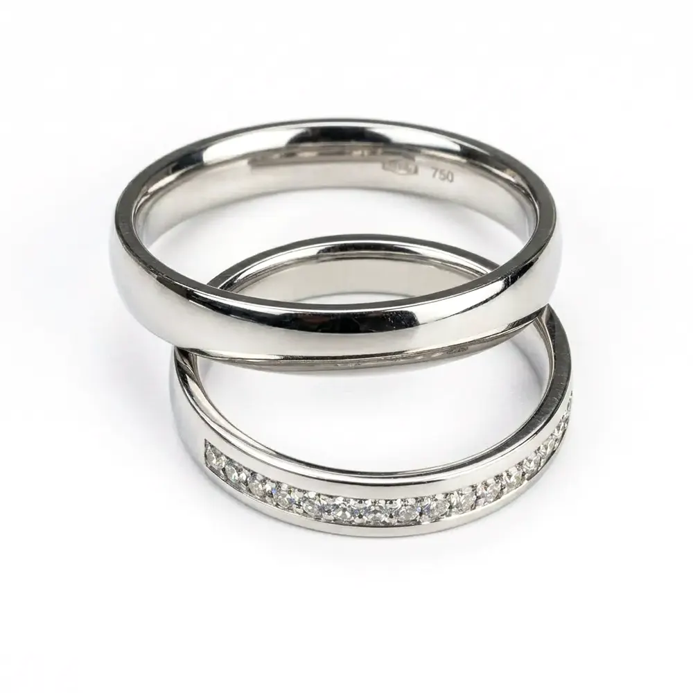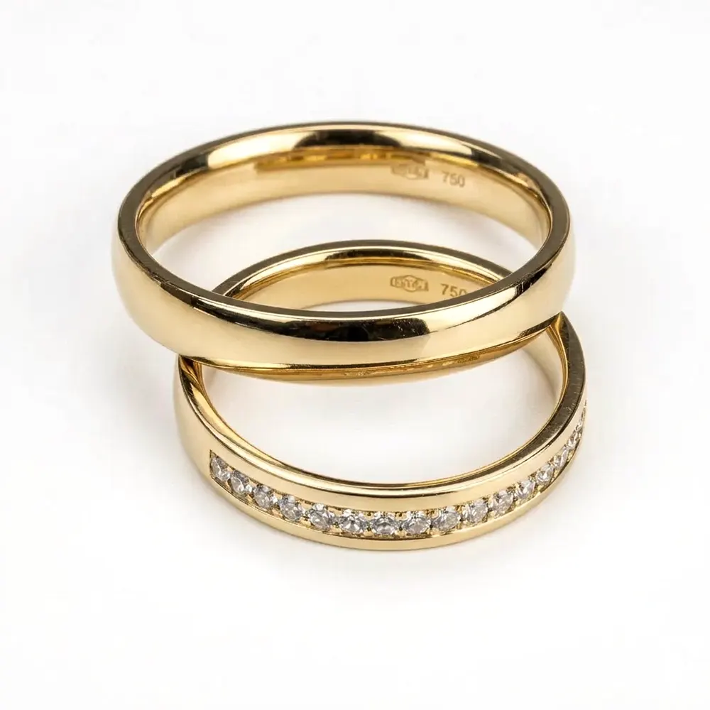 Verighete lucrate manual in aur de 14k,cu 17 diamante de 1.3 mm pe verigheta de dama